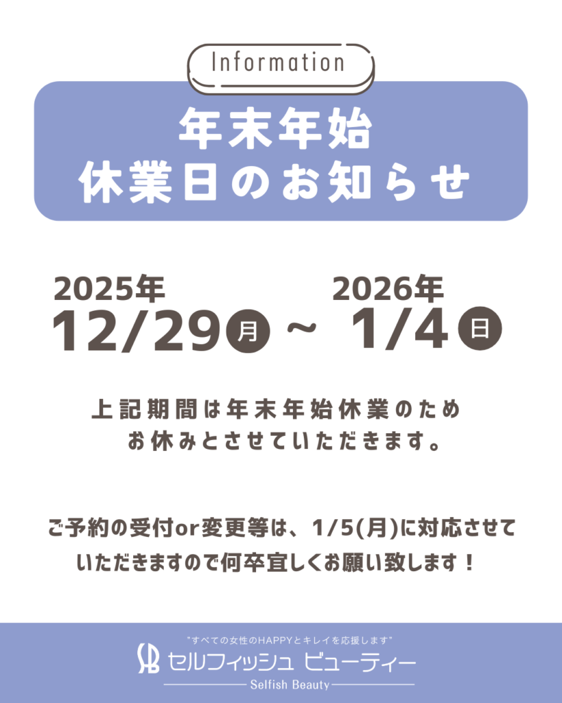 当サロンは、下記の期間を年末年始の休業とさせていただきます。